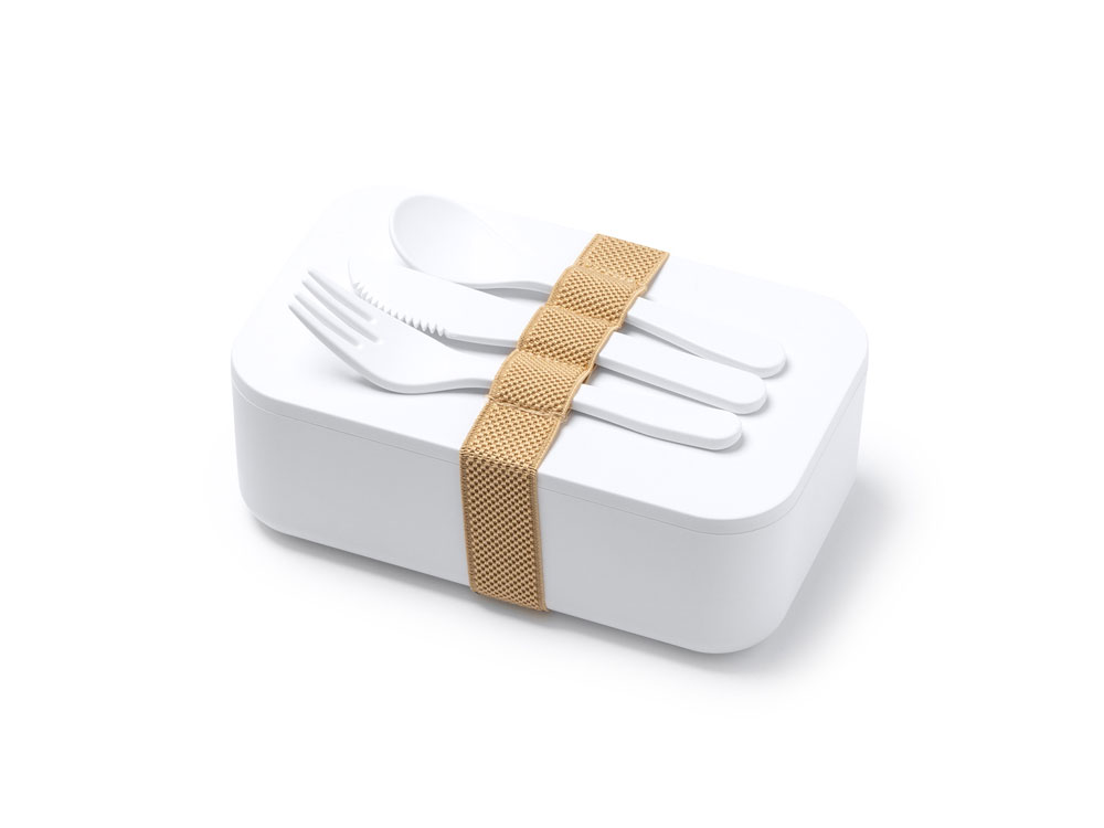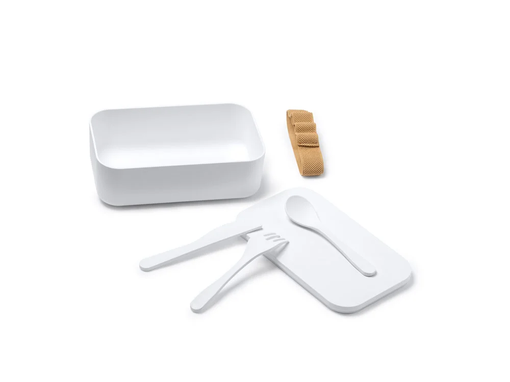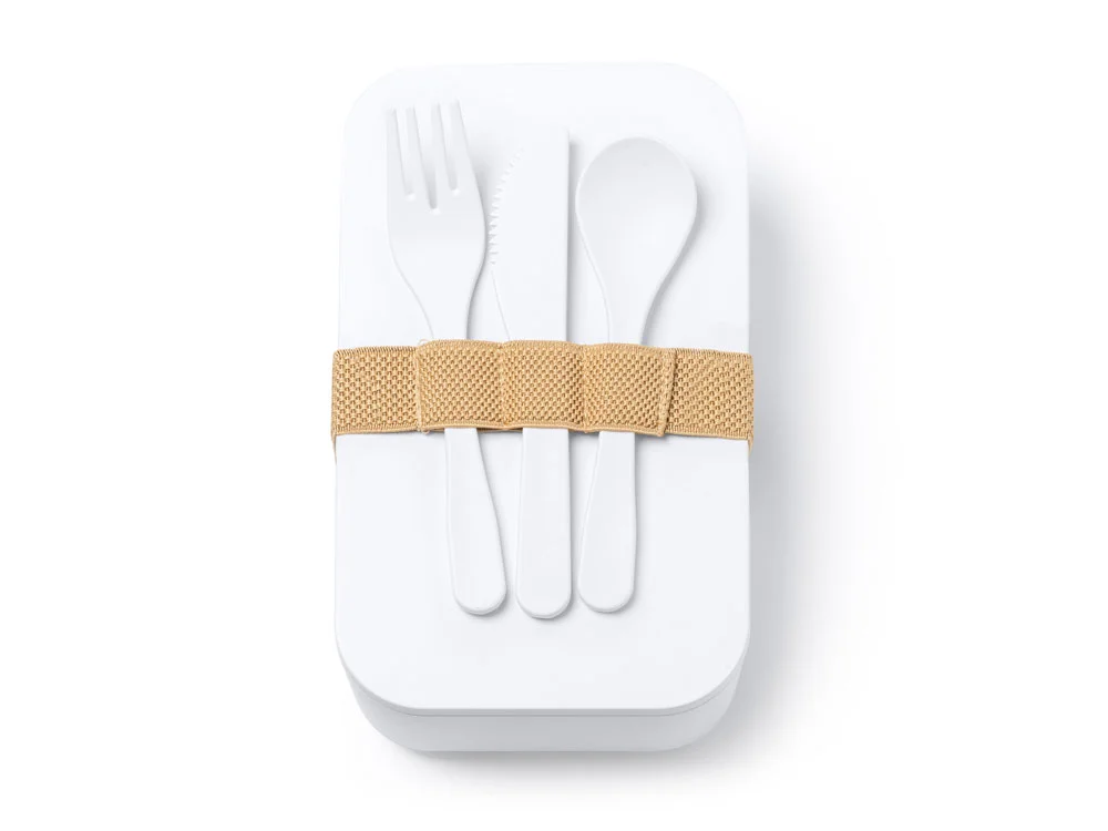 Ланч-бокс из PLA с силиконовым ремешком для регулировки. В комплекте вилка, ложка и нож. Емкость 1 л Наслаждайтесь едой в любом месте.