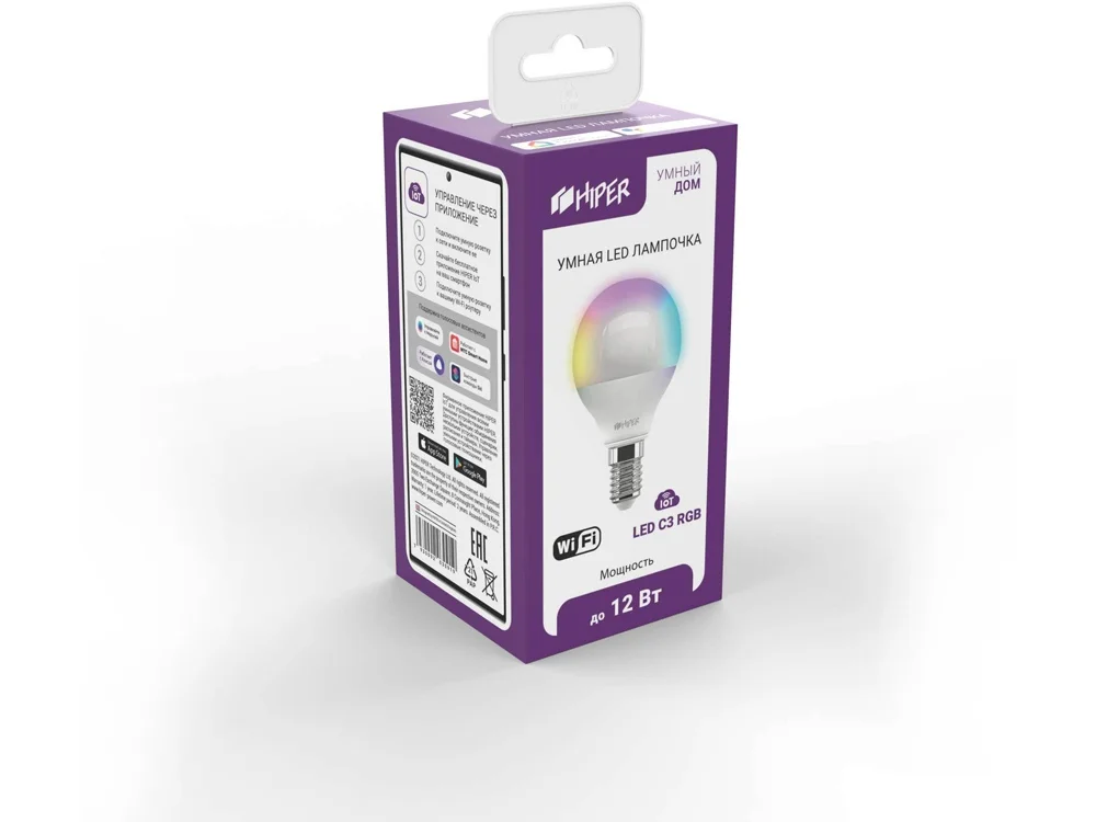 Умная светодиодная лампочка HIPER IoT LED C3 RGB в форме шара G45, поддерживает удаленное управление через приложение и предназначена для использования в любых устройствах для освещения со стандартным цоколем E14, расширяя их возможности.
