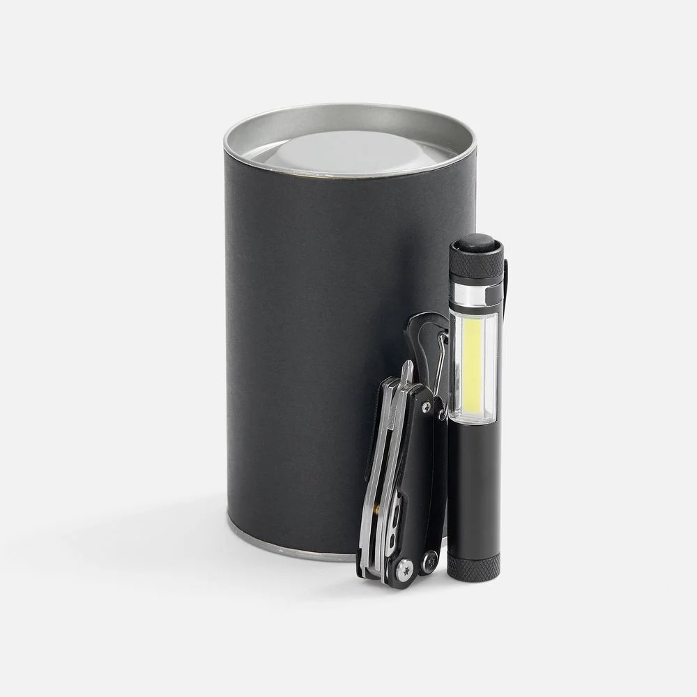 Миниатюрный, но незаменимый набор с мультитулом и фонариком в аккуратном тубусе.